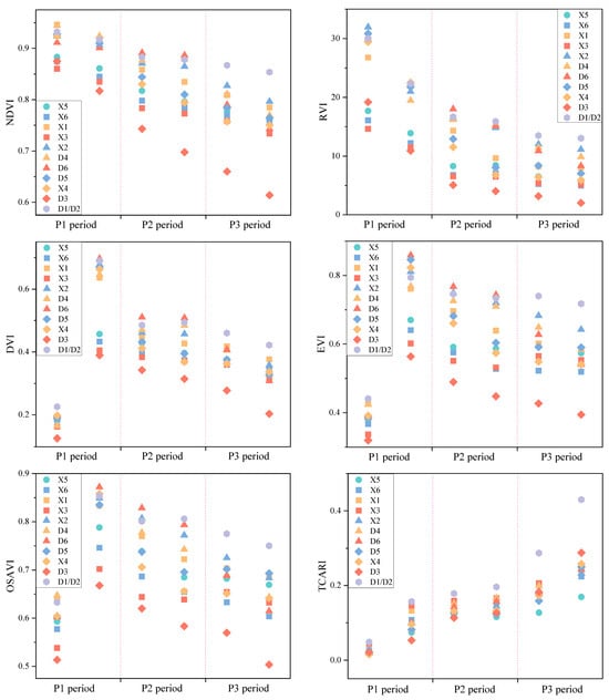 Figure 11 shows the variation curves of six vegetation indices under different drought levels during the different growth periods of winter wheat. The results indicate that the overall NDVIs show a downward trend, with a relatively gentle rate of change. The X5 plot has the highest NDVI, and the D1 and D2 plots have the lowest NDVI. During the P1 period, NDVIs decreased in plots subjected to drought, with the declining trend becoming more pronounced as the severity of the drought increased. After rewatering, the NDVIs of X6, X1, and X3 remained lower than those of the X5 plot, yet the trend of change was similar. Similarly, during the P2 period and P3 period, as drought commenced and its severity increased, a pronounced declining trend in NDVI was observed. After rewatering, the rate of NDVI decline slowed down. RVI showed the same trend as NDVI, with a faster rate of decline before the P2 period, followed by a more gradual decrease thereafter.