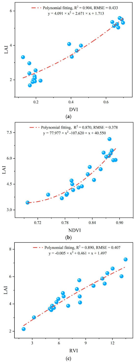 The LAI inversion model results are shown in Figure 12a–c. During the P1 period, the DVI-LAI model exhibited the highest overall inversion accuracy, with its polynomial regression model achieving an R2 of 0.904 and an RMSE of 0.433. In the P2 period, the NDVI-LAI model demonstrated the highest overall inversion accuracy, with the polynomial regression model yielding an R2 of 0.870 and an RMSE of 0.378. During the P3 period, the RVI-LAI model showed the highest overall inversion accuracy, where its polynomial regression model attained an R2 of 0.890 and an RMSE of 0.407.