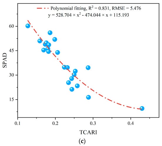 The SPAD inversion model results are shown in Figure 13a–c. From the results, it is evident that during the P1 period, the polynomial regression model of the DVI-SPAD model has the highest inversion accuracy, with an R2 of 0.893 and an RMSE of 2.294. During the P2 period, the SPAD inversion accuracy is not very satisfactory. The polynomial regression model of RVI-SPAD achieves the highest inversion accuracy, with an R2 of 0.661 and an RMSE of 1.538. In the winter wheat P3 period, the polynomial regression model of TCARI-SPAD shows the highest inversion accuracy, with an R2 of 0.831 and an RMSE of 5.476.