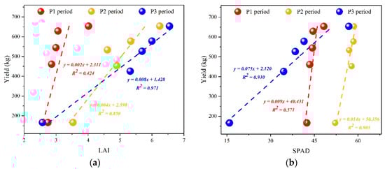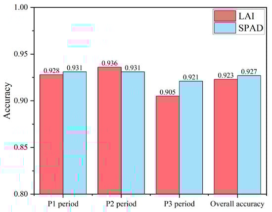 For the LAI, the accuracy of the P1, P2, and P3 growth periods is 92.8%, 93.6%, and 90.5%, respectively, with a total accuracy of 92.4%. For the SPAD index, the accuracy of the P1, P2, and P3 growth periods is 93.1%, 93.0%, and 92%, respectively, with a total accuracy of 92.7% (Figure 14).