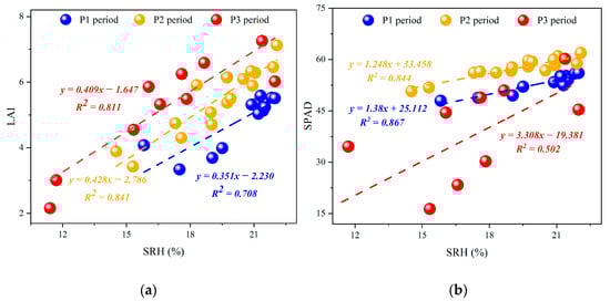 Regression equations of drought monitoring indices and SRH data: (a) regression equation of LAI and SRH; (b) regression equation of SPAD and SRH.