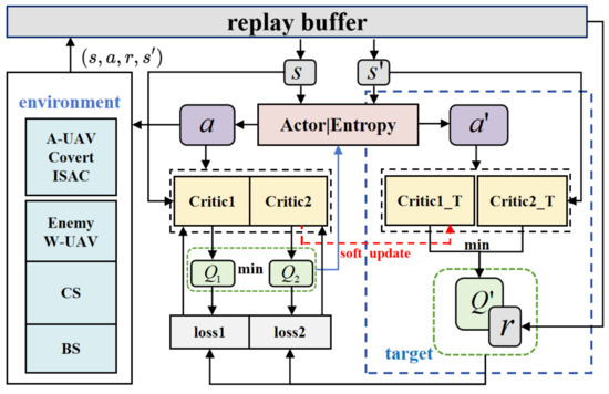In this paper, we address environmental uncertainty by employing a policy-based, model-free DRL approach known as SAC. This off-policy actor-critic algorithm is particularly suitable for scenarios involving continuous action spaces [25]. We have tailored the SAC algorithm to handle charging scenarios and covert communication, referred to as SAC-CC. The goal is to optimize the A-UAV’s trajectory and bandwidth allocation between sensing and communications, while adhering to constraints such as covertness, energy limitations, and maximum propulsion power to maximize the CCTR.