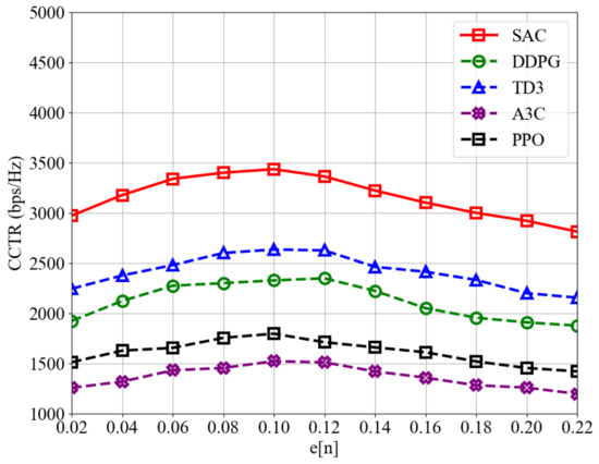 To explore the trade-off between radar position estimation error and CCTR, the results are shown in Figure 5. When is low, the improved accuracy of position estimation reduces tracking errors but consumes more bandwidth resources, which could otherwise be used for communication, leading to a decrease in CCTR. Conversely, a higher saves radar bandwidth but may compromise position estimation accuracy, increasing tracking errors and similarly reducing CCTR. This highlights the existence of an optimal that maximizes CCTR while maintaining covert communication quality. Additionally, Figure 5 demonstrates that the SAC-CC algorithm consistently achieves a higher CCTR compared to other DRL algorithms across different values, further demonstrating its superior performance in optimizing UAV trajectory and bandwidth allocation in dynamic environments.