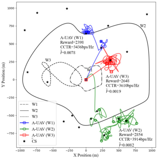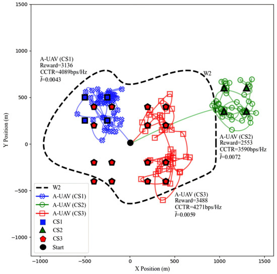 Next, we analyze the effectiveness of the algorithm under varying CS quantities and spatial distributions, with the W-UAV’s trajectory fixed to W2 in Figure 7. In the CS1 distribution, the limited number of charging stations, which are only concentrated in the second quadrant, often places the A-UAV (our unmanned aerial vehicle) in close proximity to the W-UAV, thereby increasing the risk of eavesdropping. Under this setup, the A-UAV achieves a CCTR of 4089 bps/Hz, maintaining effective covertness despite the proximity to the W-UAV. The CS2 distribution, which is only in the first quadrant and far from the origin BS, poses greater challenges for the A-UAV in terms of both charging and communication. As a result, the A-UAV’s CCTR decreases to its lowest value of 3590 bps/Hz, with reaching 0.0072, still below the eavesdropping threshold of 0.01, demonstrating the trade-off challenges between charging and communication in terms of the overall reward. In contrast, the CS3 distribution features a greater number of CSs distributed evenly across all four quadrants, providing the A-UAV with more options. This setup allows for a wider range of trajectories and dynamic adjustments to the distance from the W-UAV, resulting in the highest CCTR of 4271 bps/Hz, and of 0.0059, still below the eavesdropping threshold of 0.01. These results highlight that a well-planned layout of CSs is essential for optimizing the A-UAV’s performance under covert communication and energy constraints.