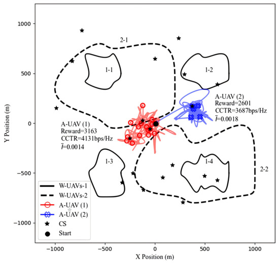 To thoroughly evaluate the SAC-CC algorithm, we extend its functionality and compare its performance in different multi-adversary UAV scenarios. In Scenario 1, as shown in Figure 8, four W-UAVs with distinct trajectories are located in the first, second, third, and fourth quadrants, respectively. To maximize the CCTR, the A-UAV strategically flies near multiple charging stations (CS) close to the central BS. This setup enables the A-UAV to dynamically plan its trajectory with sufficient energy supply, effectively avoid eavesdropping by adversarial UAVs, and maintain a reliable communication link with the BS. The SAC-CC algorithm achieves high CCTR in this scenario by optimizing trajectory and bandwidth allocation while minimizing eavesdropping risks. In Scenario 2, two adversarial UAVs with broader trajectories span the first–third and third–fourth quadrants, respectively. Here, the A-UAV opts to stay near a charging station in the second quadrant, avoiding the charging stations near the BS due to the proximity of adversarial UAVs, which increases the risk of eavesdropping. This strategy balances the distance between the A-UAV, adversarial UAVs, and the BS, optimizing the trade-off between covert communication and link quality. A comparison of these scenarios highlights the SAC-CC algorithm’s adaptability and robustness in multi-adversary environments. It dynamically adjusts flight strategies based on adversarial UAV layouts and trajectories, ensuring optimal covert communication performance. These results highlight the SAC-CC algorithm’s effectiveness in handling complex adversarial threats, offering strong technical support for real-world multi-adversary UAV scenarios.