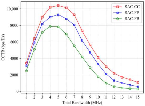 CCTR comparison of the three variants of the proposed SAC-CC algorithm under different total bandwidth settings.