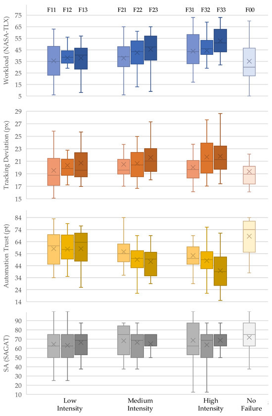 Boxplot representation of mean and fluctuation trends for Workload, Tracking Deviation, Automation Trust, and Situation Awareness under Varying Failure Codes.