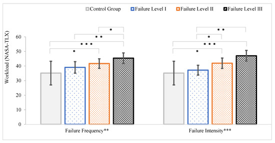 Fluctuation of NASA-TLX with failure frequency and intensity. Error bars indicate ±1 standard error of the estimated marginal means. *** p < 0.001, ** p < 0.01, * p < 0.05.