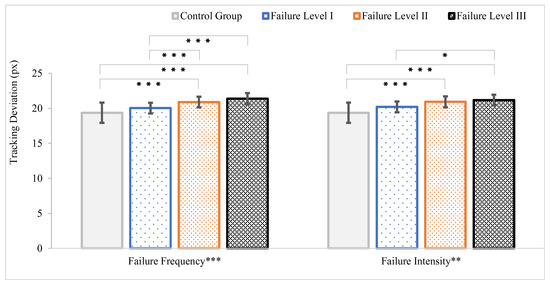 The significance of the difference between groups in the figure was obtained using the Durbin–Conover test, and the specific data are presented in Table 3 as supplementary details. For failure frequency, post hoc tests revealed significant differences for the following comparison pairs: Control–Level II, Control–Level III, Level I–Level II, Level I–Level III. For failure intensity, post hoc tests revealed significant differences for the following comparison pairs: Control–Level II, Control–Level III, Level I–Level III. Hypothesis 1 is verified.