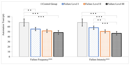Fluctuation of Jian’s automation trust scale score with failure frequency and intensity. Error bars indicate ±1 standard error of the estimated marginal means. *** p < 0.001, ** p < 0.01.