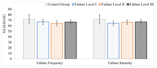 Figure 8 shows the descriptive statistics for SAGAT scores across different levels of failure frequency and failure intensity. No significant main effect was found for either failure frequency (F(3, 57) = 1.34, p = 0.272, partial η2 = 0.066) or failure intensity (F(3, 57) = 1.40, p = 0.251, partial η2 = 0.069).