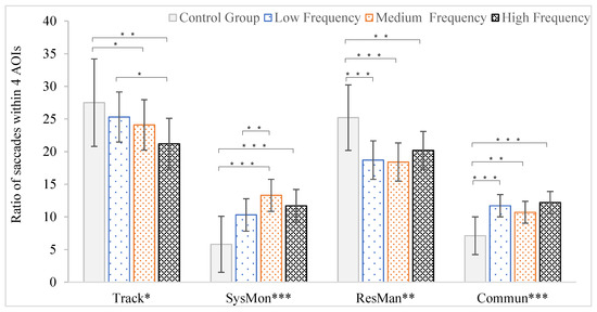 Figure 9 shows the descriptive statistics and Friedman’s test results for visual attention assigned to different subsystems at different failure frequencies. Friedman’s test results show that Track (χ2(3) = 10.705, p = 0.013, Kendall’s W = 0.188), SysMon (χ2(3) = 19.232, p < 0.001, Kendall’s W = 0.337), ResMan (χ2(3) = 13.421, p = 0.004, Kendall’s W = 0.235), and Commun (χ2(3) = 20.934, p < 0.001, Kendall’s W = 0.367) were all significantly affected by the frequency.