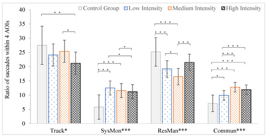 Figure 10 shows the descriptive statistics and Friedman’s test results for visual attention assigned to different subsystems at different failure intensities. Friedman’s test results show that Track (χ2(3) = 7.863, p = 0.049, Kendall’s W = 0.138), SysMon (χ2(3) = 17.968, p < 0.001, Kendall’s W = 0.315), ResMan (χ2(3) = 22.768, p < 0.001, Kendall’s W = 0.399), and Commun (χ2(3) = 30.081, p < 0.001, Kendall’s W = 0.528) were all significantly affected by the intensity.