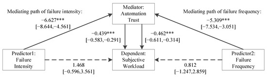 Mediation effects analysis: Failure intensity had a significant effect on subjective workload (the total effect was significant, p < 0.001). However, the direct effect was not significant (p = 0.168). Additionally, there was a significant mediating effect of automation trust on the relationship between failure intensity and subjective workload (p < 0.001). This indicates that an increase in the number of tasks in which the automation function fails in this monitoring task reduces the operator’s trust in system automation, which in turn increases their subjective workload. Failure frequency had a significant effect on subjective workload (the total effect was significant, p = 0.003). However, the direct effect was not significant (p = 0.442). Additionally, there was a significant mediating effect of automation trust on the relationship between failure frequency and subjective workload (p < 0.001). This indicates that an increase in the number of automation failures in this monitoring task reduces the operator’s trust in system automation, which in turn increases their subjective workload. A summary of this pattern is represented in Table 5, and a mediating effect model is shown in Figure 11. Hypothesis 3 is verified.