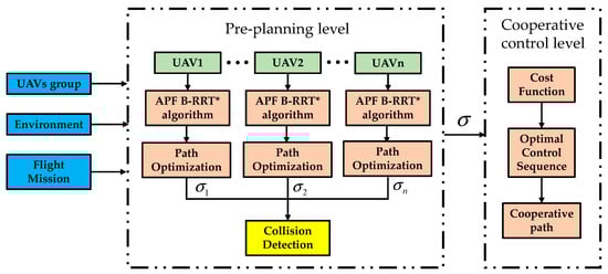 - Through the above improvements, this paper improves the search efficiency of the RRT* algorithm, reducing the search time. And the algorithm in this paper is more stable than the RRT* algorithm. Meanwhile, the algorithm has the ability to search an unknown area. It can realize fast multi-UAV path planning. Through the MPC framework, multiple UAVs can be controlled to meet the time–space coordination constraints. The frame of multiple UAVs path planning is shown in Figure 1.