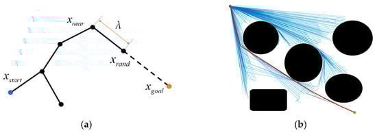 RRT* algorithm planning process. (a) RRT* node expansion process. (b) A simple path planned by the RRT* algorithm. The black area is the obstacle, the red line is the planned path.