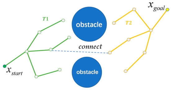 The B-RRT* algorithm searches from and at the same time to generate two random trees, and the two random trees search in the task area, respectively. When there is no obstacle between the two trees, the connect function is used to select the connection node with the minimum track cost to connect two trees to obtain the track. The schematic diagram of the B-RRT* algorithm is shown in Figure 3.
