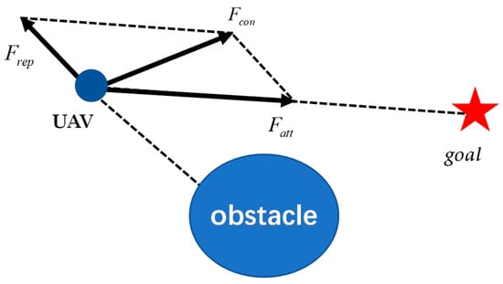The fundamental principle underpinning the APF involves the construction of a potential-field function that encapsulates the influence exerted by the current position within the field. Every location on the map is subjected to the combined effect of attractive and repulsive forces. The attractive force is generated by the target point, while obstacles contribute repulsive forces. The algorithm seeks the direction along which the potential energy diminishes most rapidly, designating this path as the optimal route at that instant. Subsequently, it guides the agent towards the target destination. The gravitational and repulsive forces of an artificial potential field are shown in Figure 4.