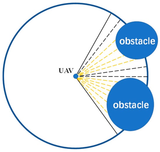 Inspired by the vector field histogram (VFH) algorithm [23], the task area was divided into several sectors, and several pre-samples were performed in each sector to calculate the forward cost. The low-cost sectors closest to the sector of the sub-target point are selected as passable sectors, and then, random sampling is carried out in these passable sectors. The pre-sampling process is shown in Figure 5.