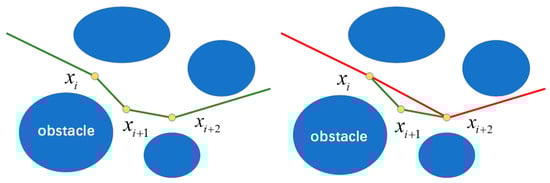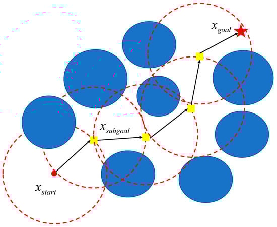 In random tree expansion, an adaptive step size can be used to make random tree expansion more efficient [24]. A larger step size is taken to search forward in the wide area, and a smaller step size is used to explore the area in the area with more obstacles.