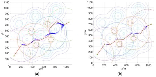 Planning process of two algorithms. The dashed circle is the rolling windows, the blue line is the random tree generated when searching, and the red line is the planned path. (a) Planning result of the B-RRT* algorithm. (b) Planning process of the APF B-RRT* algorithm.
