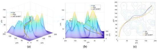 Planning results of three algorithms. (a) 3D view. (b) Front view. (c) Top view.