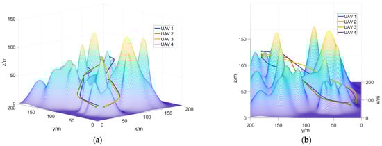 Table 5 shows the starting point and goal point of 4 UAVs in 3D-map1. One of the path planning results is shown in Figure 13.