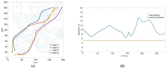 Cooperative path planning of 4 UAVs in 3D-map1. (a) 3D view of the result. (b) Front view of the result. (c) Top view of the result. (d) The minimum distance between 4 UAVs.