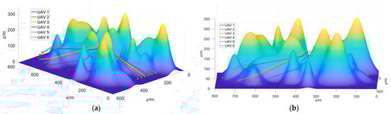 The results show that our algorithm not only has good obstacle-avoidance capabilities in the horizontal plane but also in the vertical direction. When the slope is not steep, the drone can climb along the terrain. When the ground level decreases, the UAVs will also descend along the terrain instead of maintaining a higher altitude. This helps save energy for the UAVs. Also, our algorithm can plan paths for up to six UAVs in a large and complex 3D-map.