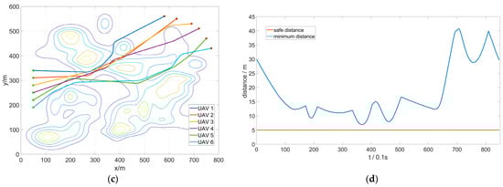 Cooperative path planning of 6 UAVs in 3D-map2. (a) 3D view of the result. (b) Front view of the result. (c) Top view of the result. (d) The minimum distance between 6 UAVs.