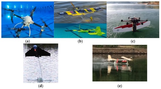 Representative cross-media vehicles (CMVs): (a) multi-rotored [12]; (b) fixed-winged [7]; (c) hybrid-winged [9]; (d) bioinspired [11]; and (e) hydrofoil [13] vehicles.