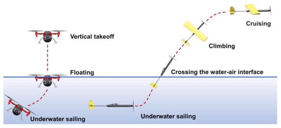 A cross-media vehicle (CMV), also referred to as a hybrid aerial–underwater vehicle (HAUV), is a novel vehicle that is specially designed to achieve repeated transitions between air and water, allowing it to operate both in air and underwater. Such vehicles possess great potential for use in ocean surveillance and as communication relays [1,2,3]. Cross-media vehicles can be categorized as multi-rotored [4,5], fixed-winged [6,7], hybrid-winged [8,9,10], and bioinspired [11]. Excitingly, in recent years, CMVs that depend on hydrofoils to glide and take-off rapidly have been developed, as shown in Figure 1.