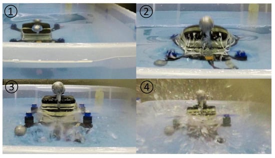 Experimental investigation is the best way to assess new phenomena and obtain laws directly. However, as the development of CMVs is still in the small-scale stage, the mixed air–water flows induced by rotors do not seem to have a significant impact on the cross-media process; as such, they have not yet received widespread attention. As a result, there have been few experimental studies on the aerodynamic characteristics of rotors or ducted fans when hovering near a water surface to date. However, there are still some special phenomena that can be observed from flight tests. In 2019, Zha et al. [27] from the University of California carried out flight tests with a quadrotor cross-media vehicle equipped with three-bladed rotors using the discontinuous cross-media method and found that there was a delay of 0.12 s before the vehicle left the water surface when the rotor was completely above the water surface, as shown in Figure 4. Zha believed that potential causes for this delay are the time needed for propeller spin-up and the generation of turbulence on the water surface due to rotor–fluid interactions. As the control strategy produces a command signal based on the expected rotor speed and thrust, an unsteady operating medium would prevent the desired thrust from being generated, causing the observed delay to occur. Despite the lack of further analysis on the thrust loss factors and quantitative measurements, to the best of the authors’ knowledge, this study is the world’s first publicly available flight test to notice the effect of mixed air–water flows on the aerodynamic characteristics of near-water rotors.