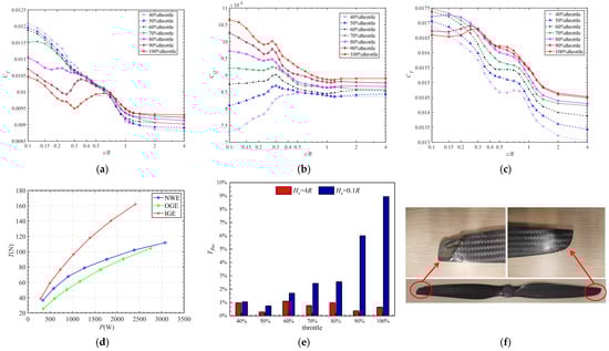 Aerodynamic performance affected by near-water effect [17]: (a) thrust coefficient of D = 0.56 m blade; (b) torque coefficient of D = 0.56 m blade; (c) thrust coefficient of D = 0.25 m blade; (d) thrust versus power of D = 0.56 m blade under NEW, IGE, and OGE states at z/R = 0.1; (e) thrust fluctuation caused by droplets of D = 0.56 m blade at z/R = 0.3; (f) structural damage caused by droplets on lower wing of D = 0.56 m blade.