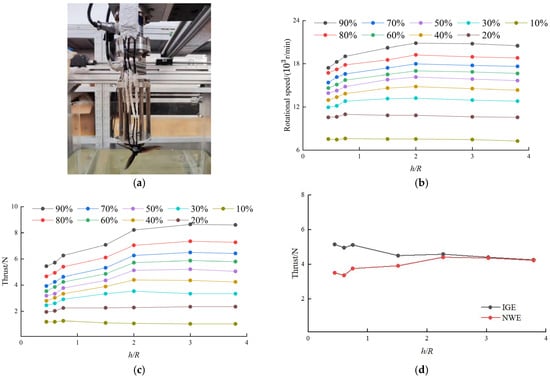 (a) Test platform; (b) rotor speed characteristic with height under the NWE at different throttle settings; (c) thrust characteristic with height under the NWE at different throttle settings; (d) comparison of rotor thrust under IGE vs. NWE [29].