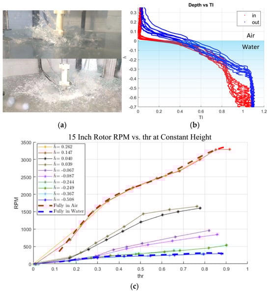 (a) Image of rotor in transition (top: at low throttle, bottom: at high throttle); (b) the variance of the Transition Index as the rotor enters or exits the water at various throttle settings; (c) RPM versus throttle at various heights between fully-in-air and fully-in-water results [30].