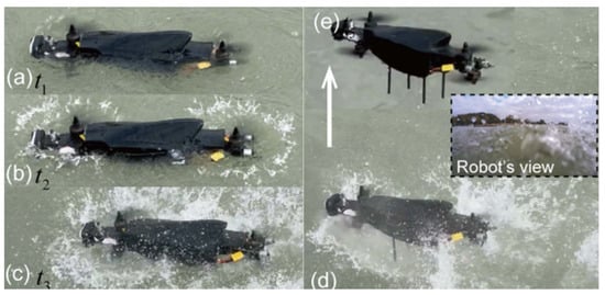 Sequence diagram of cross-media locomotion [31]. (a) t1=1.82 s; (b) t2=3.47 s; (c) tc=4.84 s; (d) t4=5.82 s; (e) t6=7.00 s.