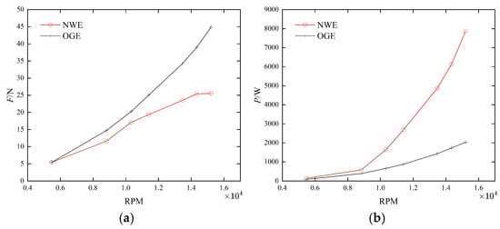 Comparison of experimental results (OGE vs. NWE) [34]: (a) thrust; (b) power.