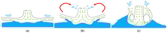 Schematic of typical depression modes [35] (the green arrows show the approximate trajectory of air, the red curve shows the approximate trajectory of the droplets entering the rotor disk): (a) dimpling; (b) splashing; (c) penetrating.