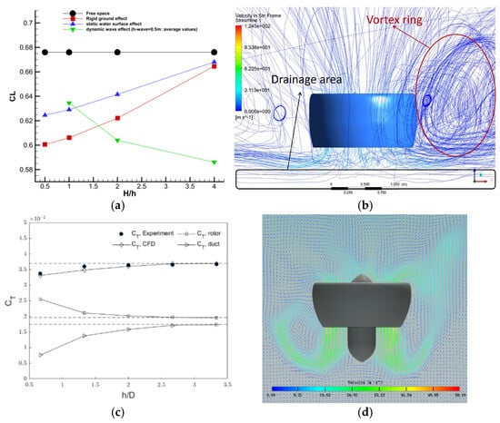 The specific influence mechanism is that, upon interaction with the water surface, the wake generated by the ducted fan rebounded laterally along the sides of the duct. This intermittent entrainment of the jet flow by the rotor led to the development of a closed, ring-shaped airflow structure, commonly referred to as the vortex ring state. It is worth noting that the thrust generated by the ducted fan can be divided into two components: rotor thrust and duct thrust. As such, the effects on ducts and rotors should be discussed separately. The high-pressure region under the rotor induces airflow deceleration around the duct, weakening the duct’s thrust performance due to suction spike loss near the leading edge. As the rotor height above the water surface increases, the vortex ring gradually shifts downward and weakens. Notably, as the ducted fan approaches the water surface, the thrust generated by the rotor increases while the thrust produced by the duct decreases, ultimately resulting in a net reduction in the total thrust of the ducted fan system, as shown in Figure 13c.