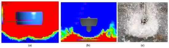 However, this study [45] only conducted numerical simulations at low rotor speeds, which showed that the thrust loss and the increase in torque are caused by the vortex ring. In fact, considering the near-water experiments discussed in Section 2, ducted fans are highly susceptible to transitioning into a penetrating mode. The vigorous interaction between the ducted fan’s downwash and the water surface results in substantial spray ingress into the duct, highlighting the need to account for medium variations and droplet dynamics. Nevertheless, existing studies have predominantly relied on the VOF method for simulations, which lacks the capability to accurately capture the violent fragmentation of the water surface and the subsequent spray dispersion phenomena. Consequently, the results obtained from numerical simulations may exhibit substantial discrepancies when compared to actual experimental observations, as shown in Figure 14.