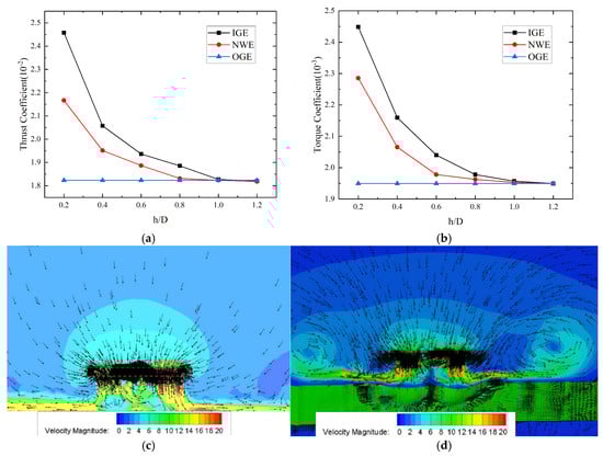 Velocity contour map and aerodynamic characteristics [47]: (a) thrust coefficient at different rotor heights; (b) torque coefficient at different rotor heights; (c) the velocity magnitude field under the IGE state; (d) the velocity magnitude field under the NWE state.