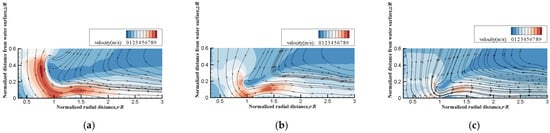 Time-averaged velocity field measured via PIV at different rotor heights off the water surface [35] (arrows represent streamlines): (a) z/R = 0.5; (b) z/R = 0.2; (c) z/R = 0.1.
