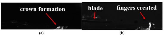 Droplets generated by interface instability at low rotor speeds [35]: (a) crown formation; (b) finger structure.