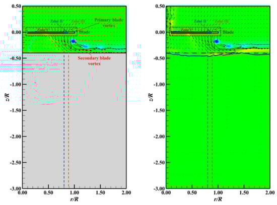 Flow field through a hovering rotor under IGE (the left column in each subgraph) or FSE (the right column in each subgraph) conditions. Plots show sectional contours of dimensionless vorticity. The dark blue solid line represents the free surface at the end, while the black dashed line represents the free surface at the initial state [49].