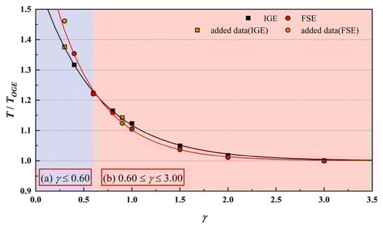 Comparison of the normalized rotor thrust vs. dimensionless rotor-plane distance between the two proximity conditions. The black solid line represents the fitted curve under the IGE, while the red one represents the fitted curve under the FSE. γ represents dimensionless rotor height [49].