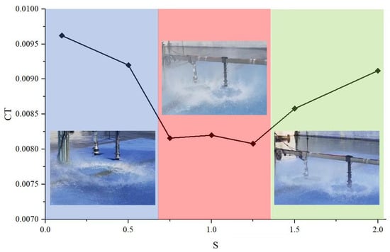 In the splashing mode, there is a shallow depression with many upwardly directed droplets impacting the blades. A clear turning point occurs in the thrust curve, after which the thrust increment begins to decrease due to droplets; however, there is almost always a net effect of thrust increment, which means that the thrust loss due to droplets or the vortex ring is less than the thrust increment, which contributes to the high-pressure zone between the rotor blade and media boundary. This kind of NWE has been observed for a D = 0.56 m two-bladed rotor blade [17].