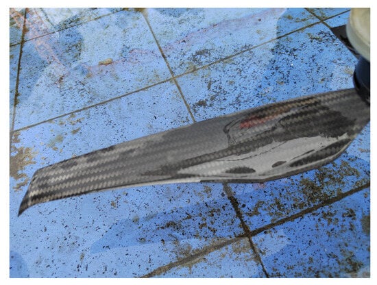 Furthermore, Bai tested three kinds of rotor blades with different airfoil and blade tip types and found that these factors had a significant effect on the torque characteristics of the rotor in the new context, as detailed in Table 1. Considering the transport and entrainment of sediment particles by the blade tip vortex in the helicopter brownout phenomenon, an attempt was made to use blades with winglets to reduce potential droplet entrainment; however, the winglets increased the contact area of the blade with the droplets, resulting in a significant torque increase (see Table 1). In addition to the effects on aerodynamic characteristics, the structural damage caused by droplets on D = 0.56 m carbon fiber blades was discovered for the first time, while D = 0.25 m blades remained totally intact, as shown in Figure 6e.
