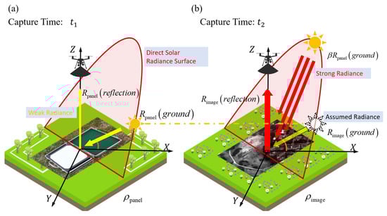 The traditional UAV reflectance calculation method assumes that the radiant energy reaching the ground at the time of capturing CRP images before the flight is equivalent to the radiant energy during image capture, as expressed in Equation (1) [39,46,47]. This traditional method presumes that the solar position remains constant between time intervals t1 and t2, as depicted by the yellow sun in Figure 1a and the dashed-line sun in Figure 1b. While this approximation is acceptable for short-endurance UAVs, it introduces significant errors for long-endurance UAVs. The solar position directly influences the radiant energy reaching the ground, as further illustrated by the yellow and dashed-line suns in Figure 1b. To address this, the STM considers changes in the solar position that lead to variations in radiant energy. Consequently, the STM provides an effective correction for this error, as indicated in Equation (1).