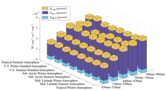 In Equation (3), β approximate represents an approximation of β , where τ denotes the atmospheric transmittance, σ λ represents the optical thickness, and R T O A refers to the radiance at the top of the atmosphere (TOA). The R diffuse g r o u n d was neglected because it accounts for only 5% to 15% of the total radiative energy, as determined through simulations of eight typical atmospheric types (tropical summer atmosphere, tropical summer atmosphere, midlatitude summer atmosphere, midlatitude winter atmosphere, subarctic summer atmosphere, subarctic winter atmosphere, U.S. winter standard atmosphere, and U.S. summer standard atmosphere) using MODTRAN (as illustrated in Figure 2). The direct radiance was calculated based on the radiance at the TOA and τ. Atmospheric transmittance over one hour was assumed to be constant due to the lack of real-time atmospheric profile data, and it was found to remain between 0.8 and 0.95 from morning to afternoon under clear sky conditions. Therefore, β approximate primarily depends on variations in solar radiation at the TOA, which can be calculated using the solar elevation angle (h) [48,49,50,51].